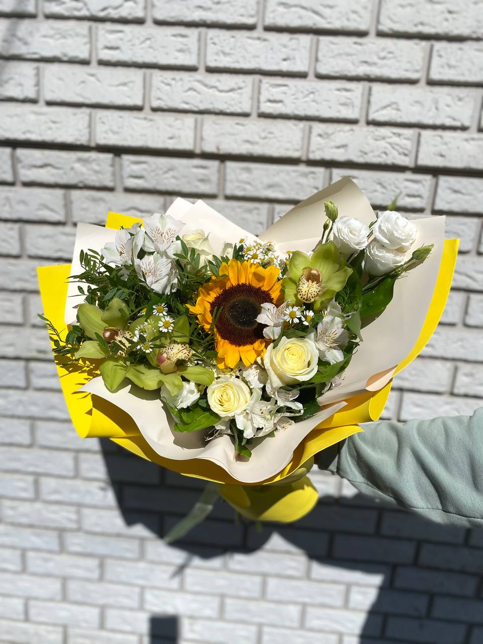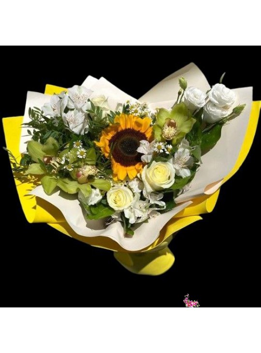 Букет «Луч солнца» — это воплощение света, радости и позитива. В композиции соединились жизнерадостный подсолнух, утончённые белые розы, благородные орхидеи и лёгкие акценты зелени.