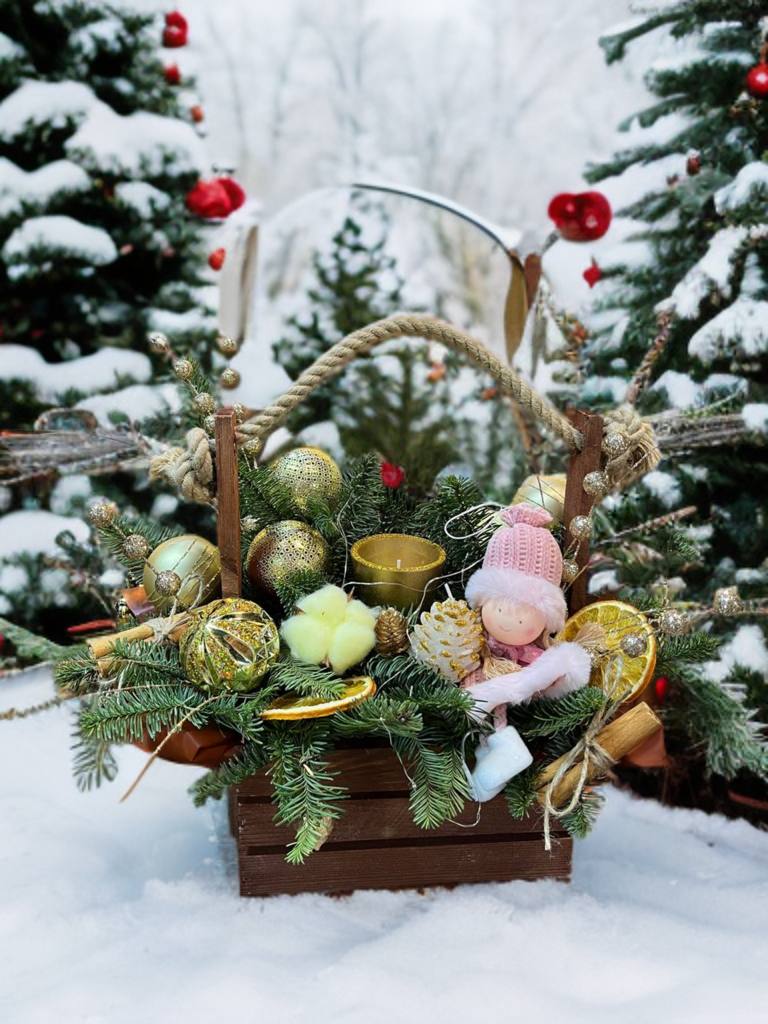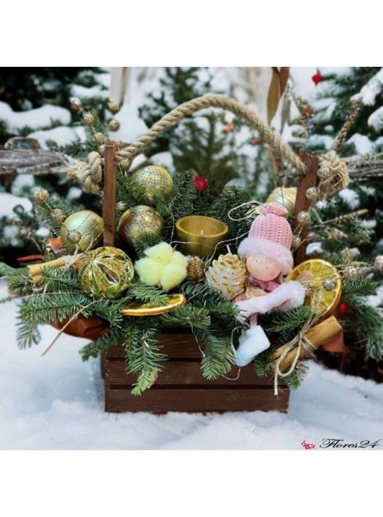 Композиция «Зимняя сказка в корзине» словно перенесена из уютного зимнего леса. Натуральные еловые ветви украшены золотыми шарами, декоративной свечой, шишками, сушёными цитрусами и милыми деталями, создающими атмосферу настоящего новогоднего волшебства.